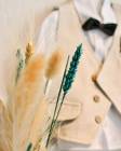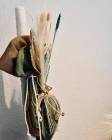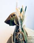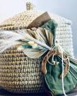 Μεγάλη ψάθινη καλαθούνα με καπάκι στολίστηκε με υφάσματα αποξηραμένα λουλούδια και πέταλο