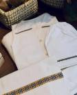 τα λαδόπανα ήταν λευκά με λεπτομέρειες απο burbery στα χρώματα της άμμου